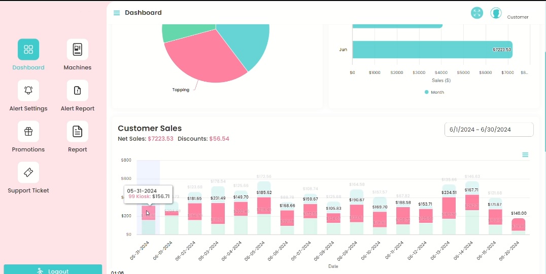 El sistema permite monitorear las ventas por máquina, cliente, método de pago y periodo de tiempo.